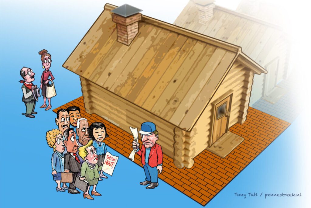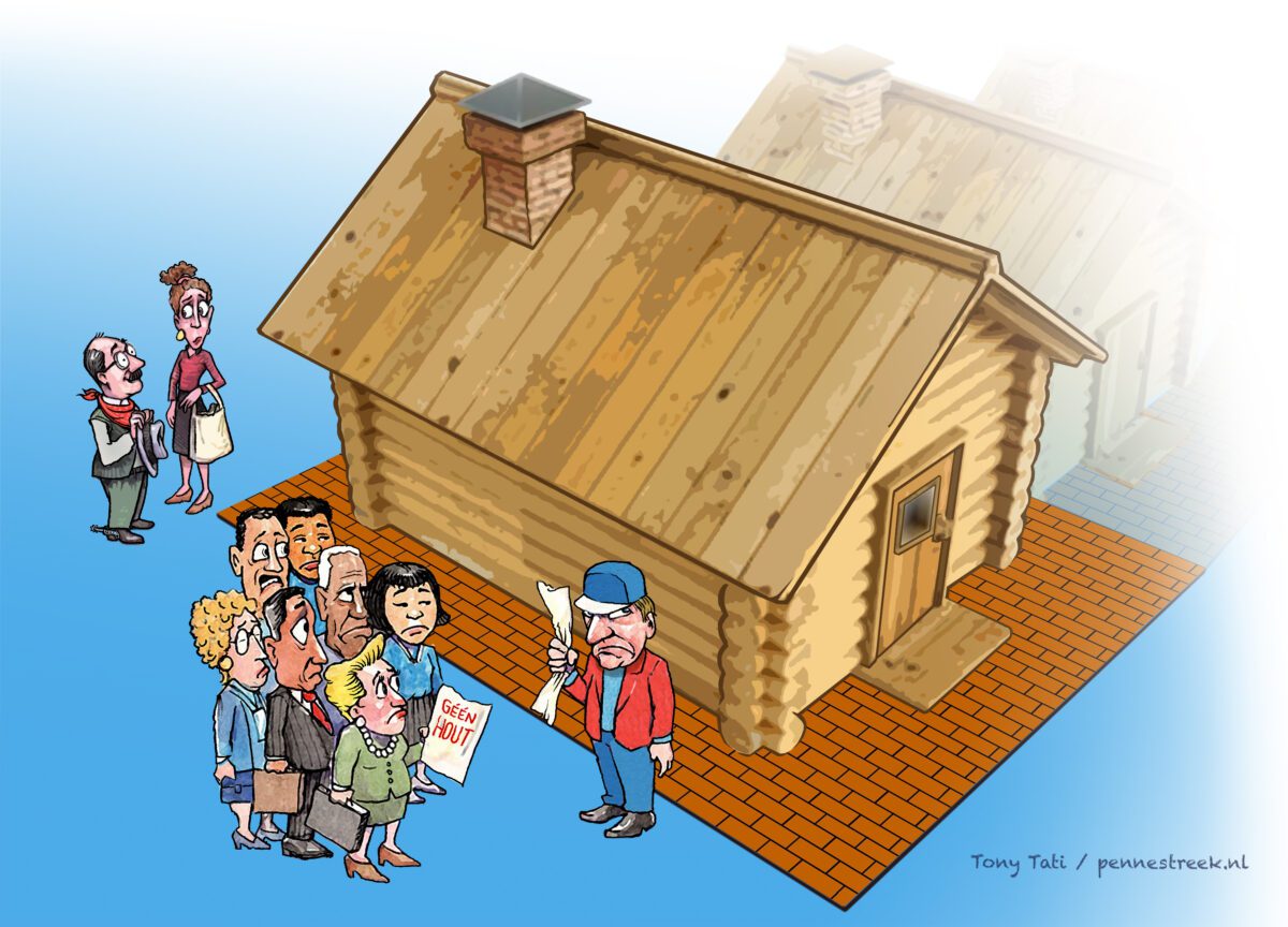 ‘Hout’. Of: ‘houten gevelbekleding’. Die woorden zijn ze nergens tegengekomen. Niet in de verkoopbrochure, technische omschrijving (TO) of op de verkooptekening. In die technische omschrijving is te lezen: ‘De buitengevels worden vanaf ca. 200 mm onder vloerpeil opgetrokken in metselsteen, handvorm waalformaat, te metselen in wildverband. Alle buitengevels worden gevoegd door middel van een doorgestreken voeg, 3-4 mm verdiept, in een standaard grijze kleur’. De bewoners zien dat de rechter zijgevel en delen van de voor- en achtergevel zijn voorzien van thermisch gemodificeerd houten gevelbekleding en accepteren die wijziging niet. Ze klagen hierover tijdens de kijkdag, alsook bij de oplevering. Ook laten ze bij oplevering noteren dat er veertig delen moeten worden vervangen: er zit scheurvorming in de gevelbekleding en er zitten gaten in.