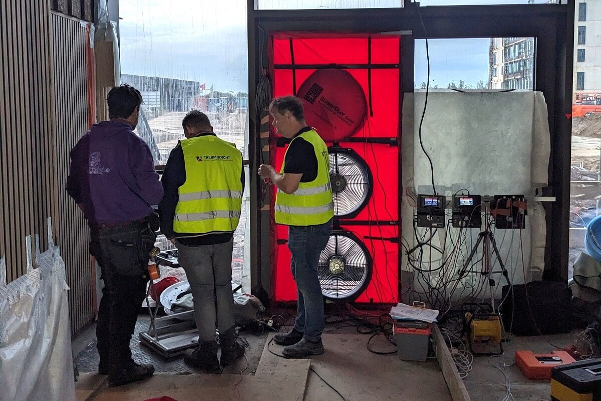 J.P. van Eesteren contracteerde Thermische Controle om de blowerdoortest uit te voeren, samen met collega-bedrijven Thermodicht en FrisseVisie. De drie bedrijven kregen ondersteuning van de Duitse fabrikant BlowerDoor, die al ervaring had opgedaan bij drie soortgelijke luchtdichtheidsmetingen van woontorens in Oostenrijk. Bac: “Op voorhand was een volledige meetopzet bepaald. Waar plaatsen we de ventilatoren, welke sparingen moeten open om te zorgen dat de lucht die we door het gebouw blazen daadwerkelijk overal komt en waar positioneren we de meetapparatuur?”