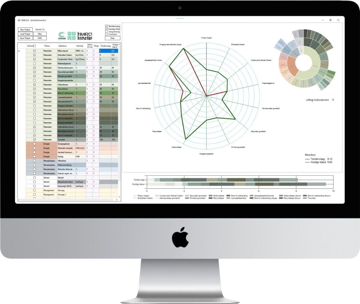 Binnen Buro Kade stoeiden de architecten met de vraag hoe ze duurzame ambities en verschillende eisen van opdrachtgevers van bouwprojecten konden formuleren, vastleggen en verifiëren. “Want”, zo vertelt directeur Tiny van Menzel van BIM-specialist BIMWYSE en Buro Kade, “voor opdrachtgevers is het, net als voor vele andere partijen, lastig om hun duurzaamheidsambitie goed vorm te geven en te verwoorden. BIMWYSE en Buro Kade vonden een oplossing in een gevalideerde, gevisualiseerde duurzaamheidsmonitor, gebaseerd op de 17 indicatoren van Het Nieuwe Normaal van het collectief Cirkelstad. Voor architecten, maar ook aannemers en toeleveranciers is zo’n visueel model makkelijker te begrijpen.”