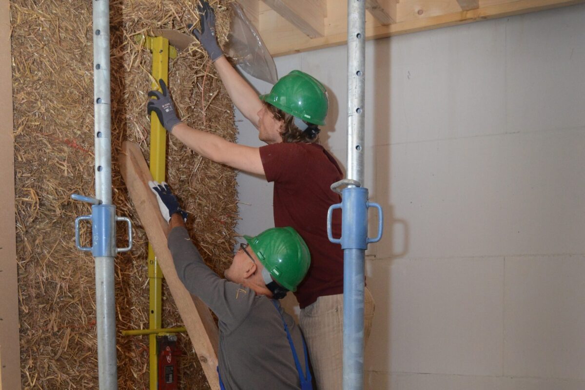 Alle balen zijn voorzien van een gezaagde sponning om de onderlinge aansluiting te optimaliseren. Ofschoon de balen op maat zijn gemaakt en er strak ingaan, zijn de strobalen vastgezet met strotouw. Metalen bevestigingsmiddelen waren uit den boze vanwege de kans op corrosievorming. Er is nog geopperd om kunststof schroeven te gebruiken voor de verankering van de balen, maar de hoge stuksprijs bleek een struikelblok. De balen worden vanaf de binnenzijde aangebracht en vervolgens afgewerkt met leemstuc. “Natuurlijk houden we toezicht en voeren we nadien controles uit. Het is niet ingewikkeld, maar we moeten erop toezien dat de balen strak tegen elkaar aan liggen en de leemstuc netjes is verwerkt”, aldus Wessels. Het leemstuc wordt met een soort kam opgebracht. De eerste laag moet er als het ware tegenaan worden gekwakt, waarna de bewoners deze gladstrijken. In de tweede laag komt een wapeningsnet om de stabiliteit van de leemlaag te garanderen. Het leemstuc vormt tegelijk de afwerklaag.