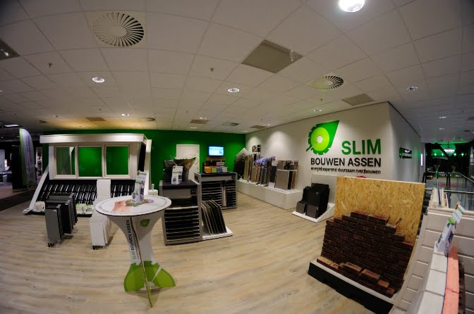 Het resultaat is Slim Bouwen Assen, een winkel op de tweede etage in Warenhuis Vanderveen, waar voorlichting en maatwerkadvies op het gebied van duurzaam wonen wordt gegeven. Van dakpannen, aanbouwen en verschillende soorten glas tot isolatiematerialen, vloerstenen en kunststof kozijnen, maar ook nieuwbouwwoningen. Alles is aanwezig in duurzaamheidswinkel. “Wij maken duurzaamheid tastbaar”, vertelt adviseur Wiebo Freuling. “Veel mensen denken bij duurzaamheid aan zonnepanelen, maar er is veel meer. Daarmee willen wij deze mensen graag in contact brengen. Zij kunnen het bij ons in de winkel zien en voelen. Dat kan bij ons tussen het winkelen door in hartje centrum. Slim Bouwen Assen is daarin uniek in Nederland.”