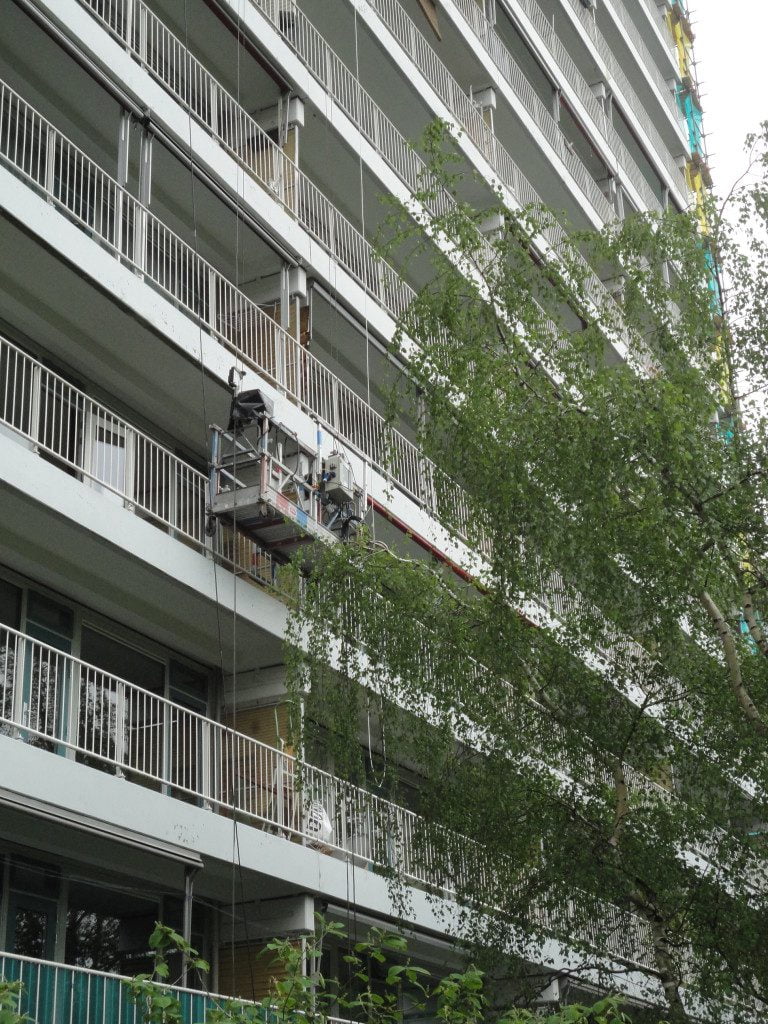 Het elektrische hangbrugsysteem van HoriVert zorgt bij de renovatie van twee flats in Rotterdam voor meer flexibiliteit en mobiliteit. Is de monorail eenmaal geplaatst en hangt de bak aan de gevel, dan kan de gebruiker zich vrij horizontaal en verticaal bewegen. Resultaat? Tijdwinst.