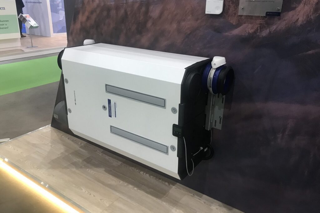 Itho Daalderop toont ook de mogelijkheid om de ventilatie-wtw achter het knieschot te verstoppen. Mooi detail is dat ook het bedieningsscherm een kwartslag gedraaid kan worden.