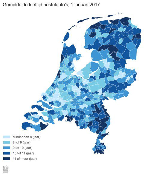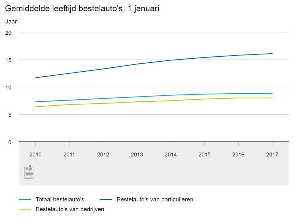 Bestelauto’s op naam van bedrijven waren begin 2017 gemiddeld acht jaar oud. Dat is bijna twee jaar ouder dan in 2010. Bestelauto’s op naam van particulieren waren gemiddeld twee keer zo oud. Met bestelauto’s werd in 2016 door bedrijven gemiddeld 19 duizend kilometer gereden. Dit meldt het CBS op basis van nieuwe cijfers.