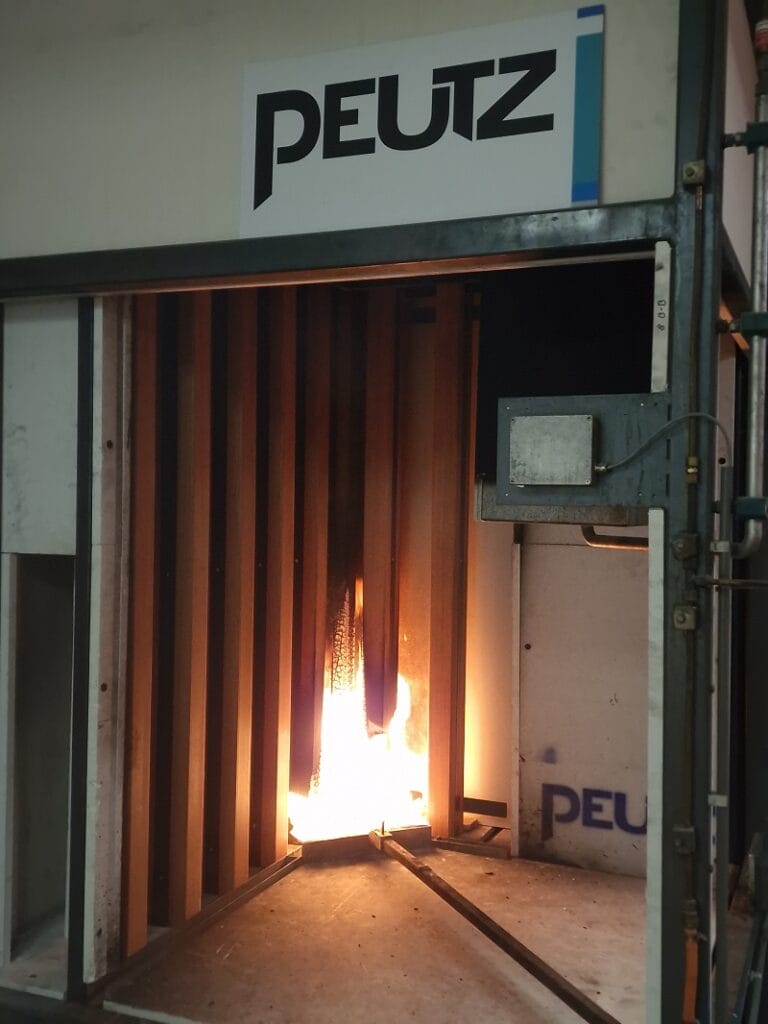 De foto bovenaan dit artikel toont een voorbeeld van een test aan een hout-aluminium raamconstructie. Op de constructie zijn de meetsensoren (thermokoppels en stralingsmeters) aangebracht voor het meten van de verschillende prestaties. Deuren en ramen voor toepassing in de buitengevel worden beproefd volgens EN 1634-1 en dienen te voldoen aan de geldende geharmoniseerde productnorm EN 16034. De resultaten zijn noodzakelijk voor CE-markering van het product. In de certificaten is duidelijk omschreven welke biobased ondersteuningsconstructies toegestaan zijn, denk hier aan de steeds meer voorkomende gevels van CLT of hsb. Deze worden separaat beproefd en vallen niet standaard onder het toepassingsgebied van een test in een steenachtige wand.